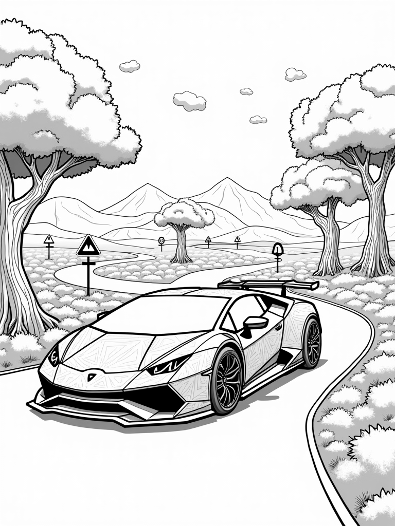 In this fun coloring page, you’ll find a sleek, futuristic Lamborghini that’s really eye-catching! It’s draped in vibrant geometric patterns, making it pop against the lush landscape. The winding road it’s resting on curves through rolling hills, while huge, swirling trees and oversized leaves create a playful backdrop. Can you imagine how cool it would be to drive this car in such a colorful world?