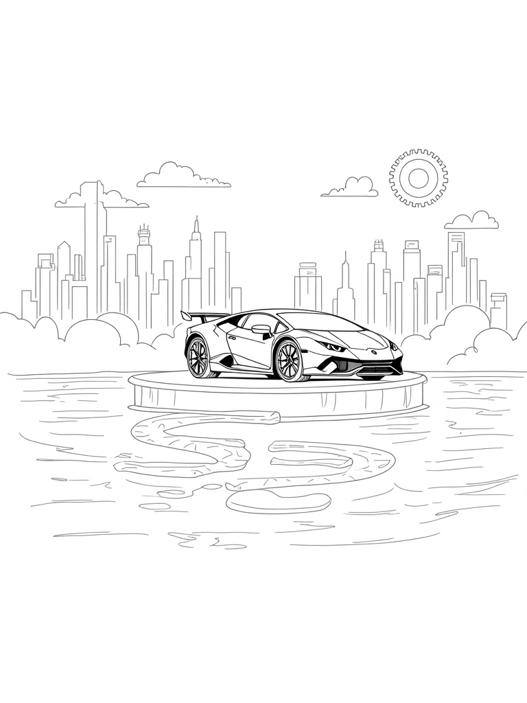 Picture a sleek, futuristic Lamborghini perched on a floating platform, ready to zoom over a vibrant city skyline. The car's smooth curves blend into a race track made of clouds, winding around glowing skyscrapers that look like they belong in a sci-fi movie. Below, you can see giant gears and pistons rising from a shimmering lake, reflecting the colorful lights above.