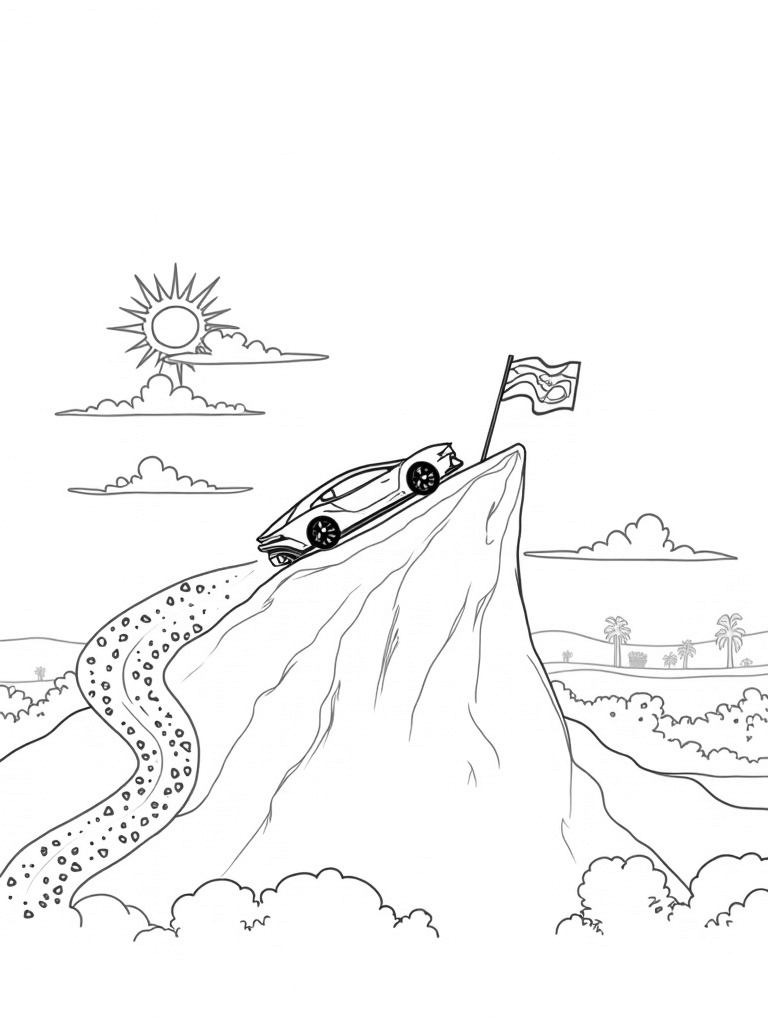 Look up and you’ll see exaggerated clouds shaped like racing flags, waving in excitement! The sun is bursting with angular rays, lighting up the whole scene. And don’t miss the colorful tire tracks sprawled across the terrain, leading to the horizon where palm trees stand tall, adding a tropical touch to this thrilling landscape.