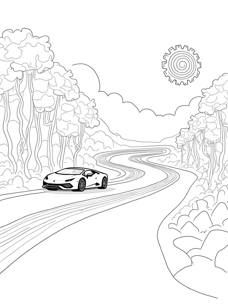 Grab this free, printable coloring page featuring a futuristic racetrack and a shiny Lamborghini! Perfect for kids who love cars and vibrant jungles, it's a fun way to unleash creativity.