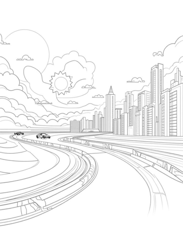 Futuristic Racetrack with Lamborghinis and Skyscrapers Coloring Page