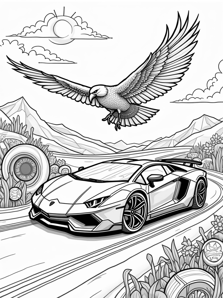 This cool coloring page shows a sleek Lamborghini transforming into a majestic eagle, its wings wide open and decorated with fun patterns. Below it, a twisting racetrack snakes through bright green hills and funky trees. It’s like a car lover's dream mixed with nature!