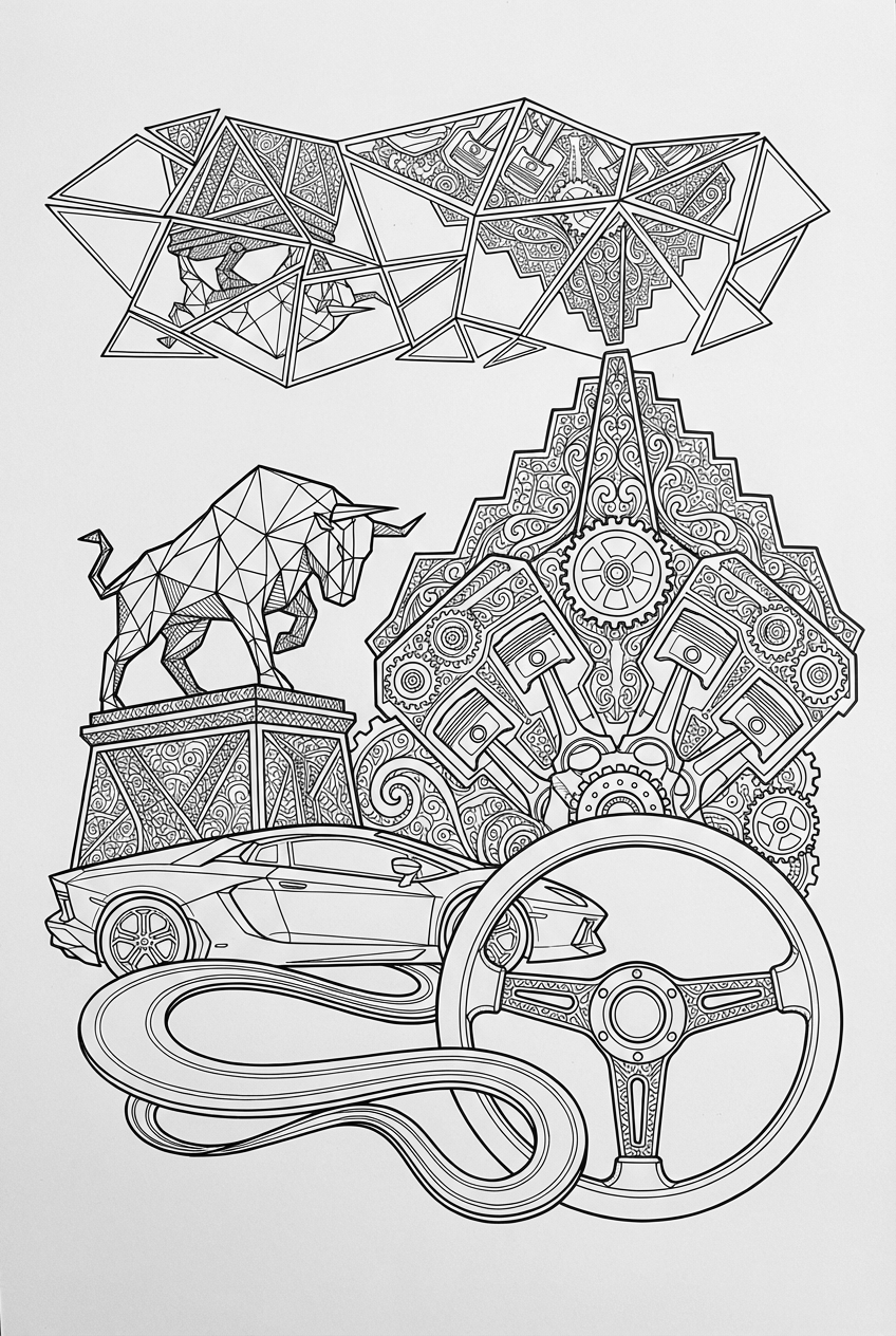 Right in the middle of the page a massive V12 engine towers like a metallic mountain, each piston stepping up like a tiny staircase. Next to it sits a sharp‑angled bull sculpture with pointy horns, perched on a sleek carbon‑fiber base. Below, a low‑slung Lamborghini rides a curvy racetrack river that winds around a giant chrome steering‑wheel disc. Overhead, the sky is made of mirrored shards that bounce the whole scene back at you. All the lines are crisp and clean, perfect for coloring in those tiny details.