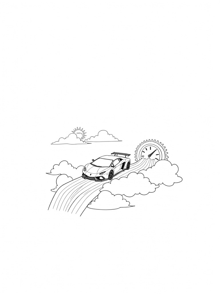 Lamborghini on a Cloudy Road with Gear-Shaped Clouds Coloring Page