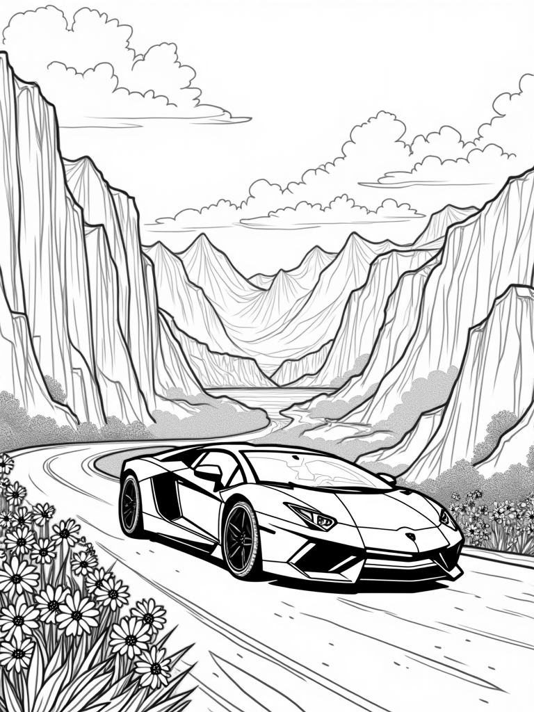 In this coloring page, a sleek Lamborghini silhouette zooms along a winding mountain road. Its shiny surface reflects the beautiful landscape all around it, making it feel like it's part of the scenery. Just look at those tall cliffs! They’re adorned with stunning waterfalls that sparkle in the sunlight, adding a magical touch to the whole scene.