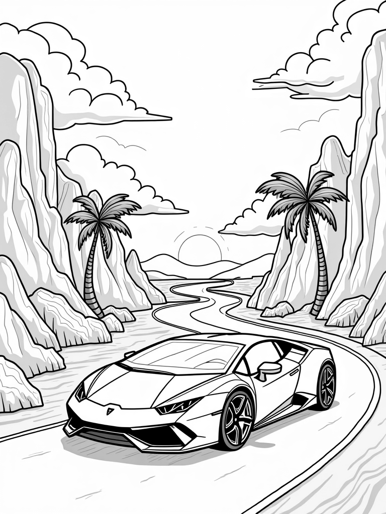 Check out this free, printable coloring page featuring a Lamborghini on a winding road surrounded by abstract mountains. Perfect for kids who love cars and unique landscapes, this coloring page is ready to bring some creative fun to your day!
