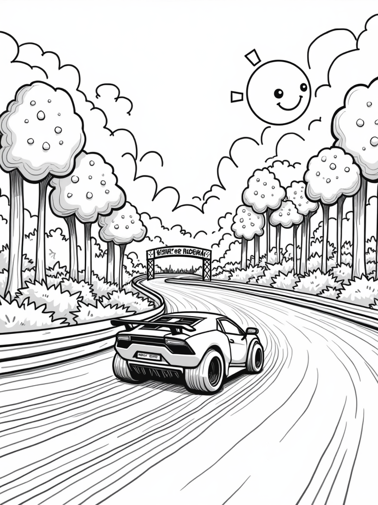 Zooming along a racing track is a sleek, cartoonish Lamborghini with oversized wheels, leaving behind a trail of rainbow tire marks. The track winds through a vibrant landscape filled with giant, colorful fruits that are just begging to be colored in. On either side of the track, towering trees with car-shaped leaves add a quirky touch, while playful clouds shaped like speedometers float in the sky. Don’t forget the cheerful sun beaming down, its friendly face making everything feel even more fun!