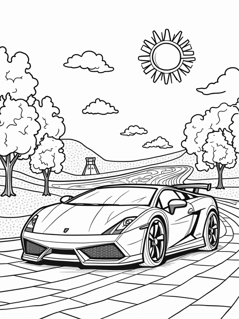 Lamborghini Sculpture on a Colorful Tile Road Coloring Page