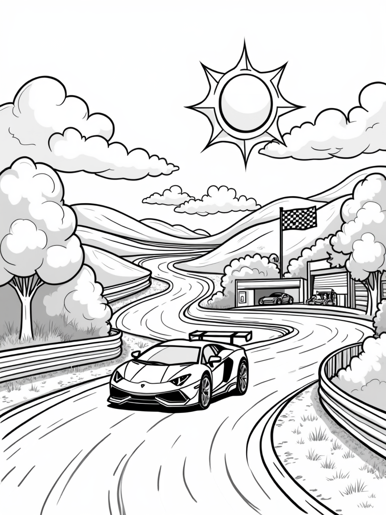 Check out this free, printable coloring page featuring a vibrant Lamborghini, a sunny pit stop, and a playful racetrack. Perfect for kids who love cars and colorful landscapes!
