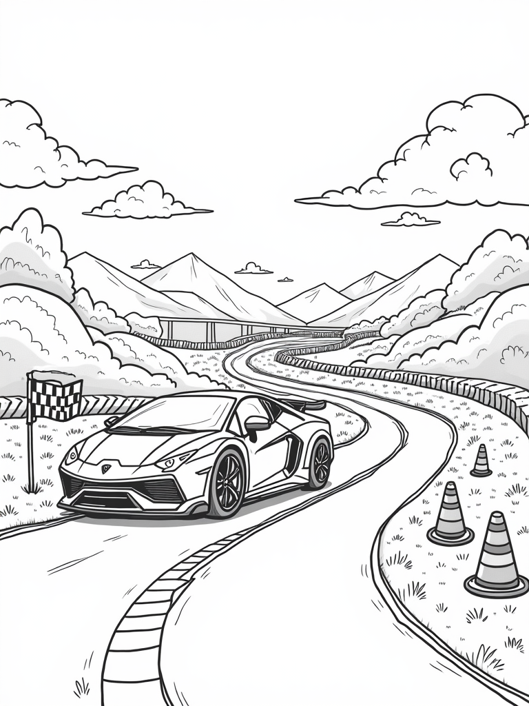 Get ready for some colorful fun with this vibrant racetrack scene! The track winds through a lush green valley, lined with oversized, bright traffic cones that are just begging to be colored in. At the center, there’s a cartoonish Lamborghini sitting proudly on a pedestal made of giant tire stacks. Its playful curves and whimsical headlights make it look like a character straight out of a storybook.