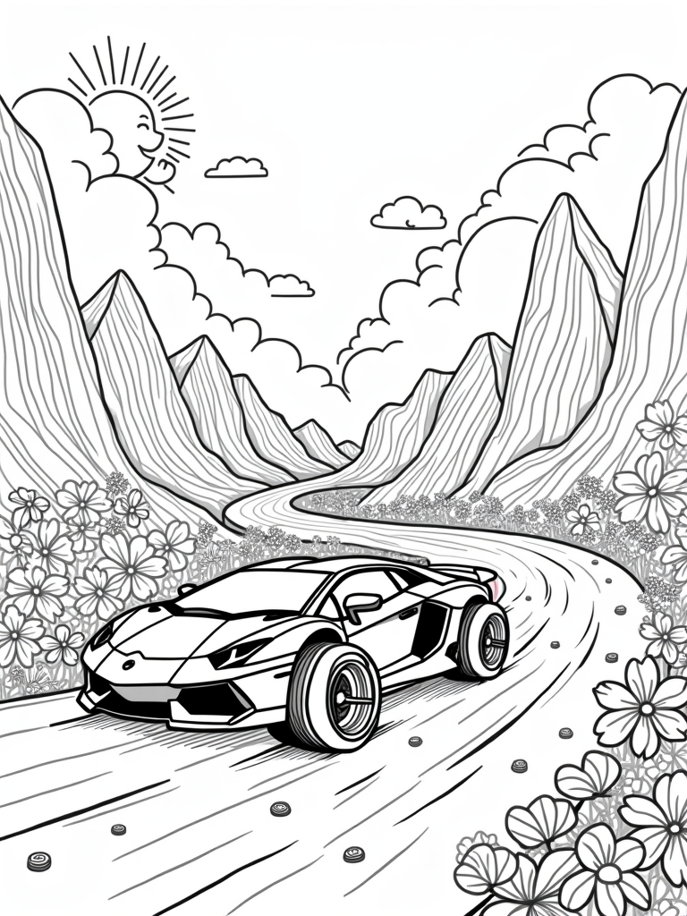 Grab this free, printable coloring page of a Lamborghini racing on a whimsical track! Perfect for little speedsters and a great addition to your coloring collection.