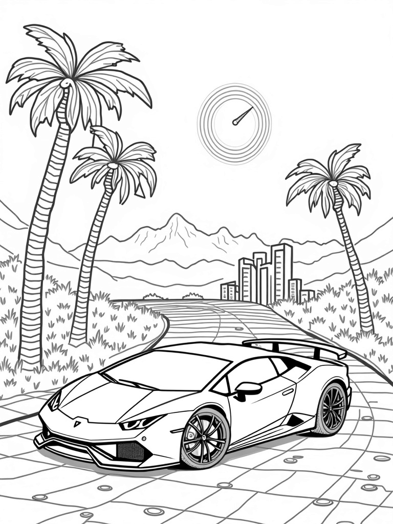 Check out this free, printable coloring page featuring a sleek Lamborghini on a colorful tile road, surrounded by palm trees and a stunning sunset. Perfect for kids who love fast cars and creative coloring fun!
