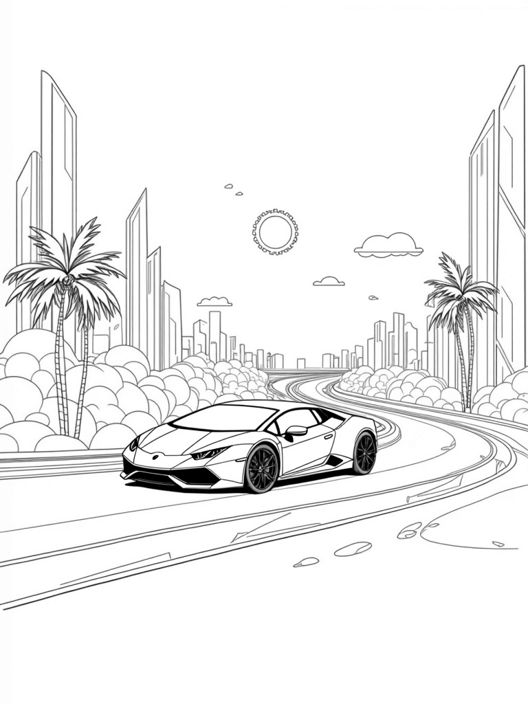 Sleek Lamborghini on a Winding Road in a Futuristic City Coloring Page