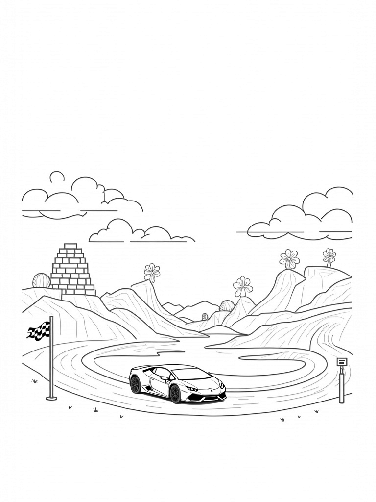 Check out this free, printable coloring page featuring a Lamborghini parked on a winding road surrounded by giant flowers and a whimsical landscape. Perfect for kids who love cars and creativity!