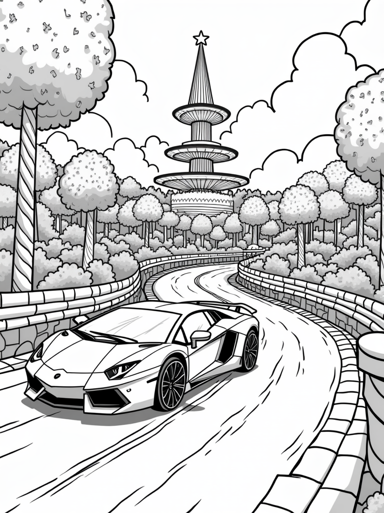 This coloring page shows an exciting racetrack spiraling through a candy-colored landscape. Picture towering lollipop trees lining the sides, their bright swirls reflecting the sleek curves of a Lamborghini zooming by. There’s even a giant chocolate fountain in the center, with gummy bears cheering from below. It’s like a candy dream come to life!