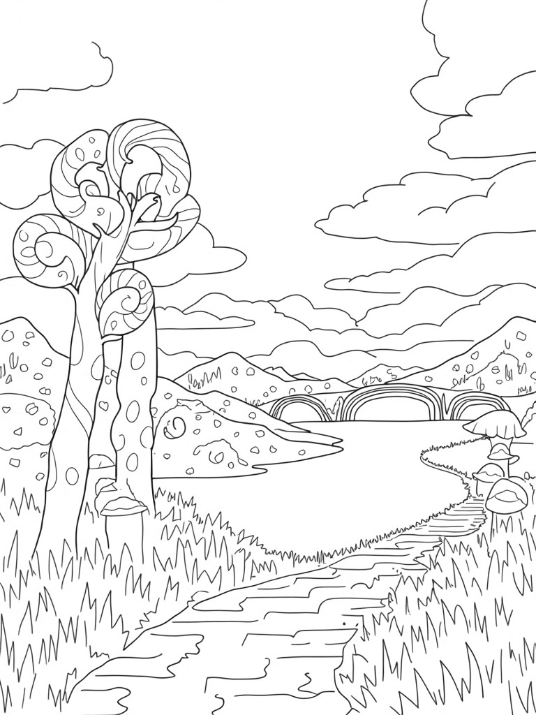 This coloring page shows a delightful landscape filled with giant, spiraled candy cane trees that seem to dance toward a pastel sky. Below, you’ll find a shimmering lake that looks like liquid glass, perfectly reflecting the vibrant clouds above. Scattered along the shore are oversized, polka-dotted mushrooms, ready for your favorite colors!