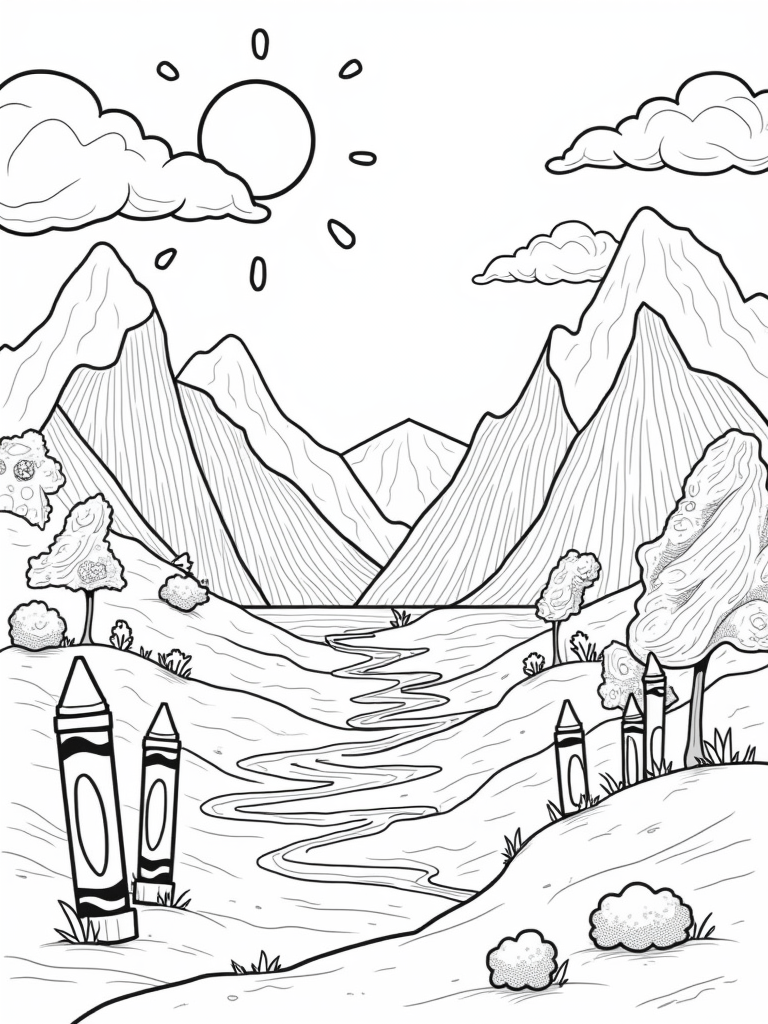 Scattered throughout this sugary landscape are oversized crayons, standing tall as colorful sentinels. They seem to say, 'Come on, grab your favorite colors and make this scene truly yours!' With clean lines and fun shapes, this page is perfect for kids who love to let their imagination run wild.