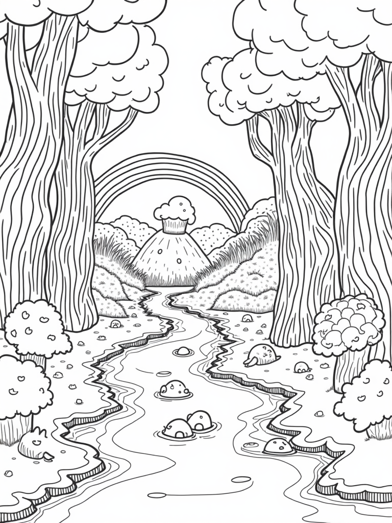 Candy Tree Forest with Chocolate River and Cupcake Hill Coloring Page