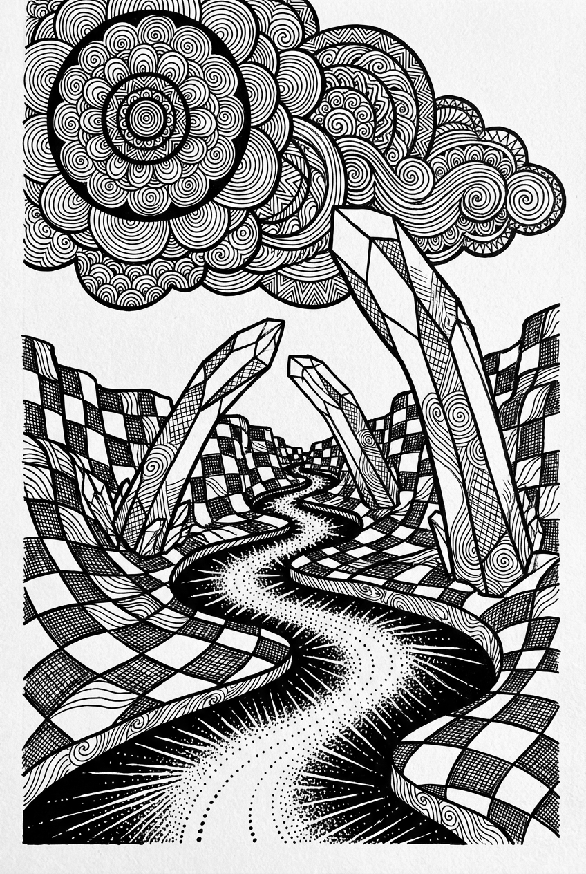 The line work is full of different textures—cross‑hatching for the canyon walls, flowing swirls for the river, and sharp facets on the crystal arches. You can play with contrast by keeping the checkerboard stark while giving the river a neon‑like glow with bright blues or greens. The mandala clouds love gradient shading, so try blending soft pastels to make them feel airy. Don’t be afraid to mix bold and delicate strokes; the variety makes the whole page pop.