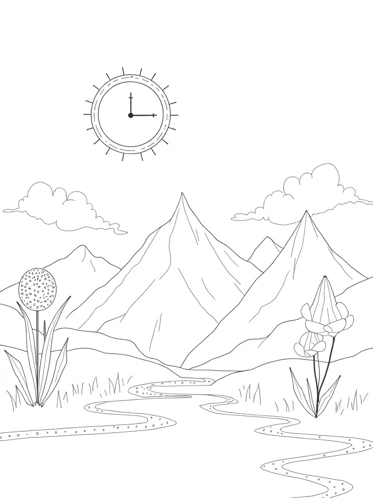 Flowing through this enchanting scenery is a serene river shaped like a winding ribbon. It has intricate patterns that invite you to color every twist and turn. Along the riverbank, oversized flowers with geometric petals bloom, adding bursts of color to this dreamlike setting. And don’t forget the gigantic sun-shaped clock hanging in the sky, with hands made of shimmering stars—how cool is that?