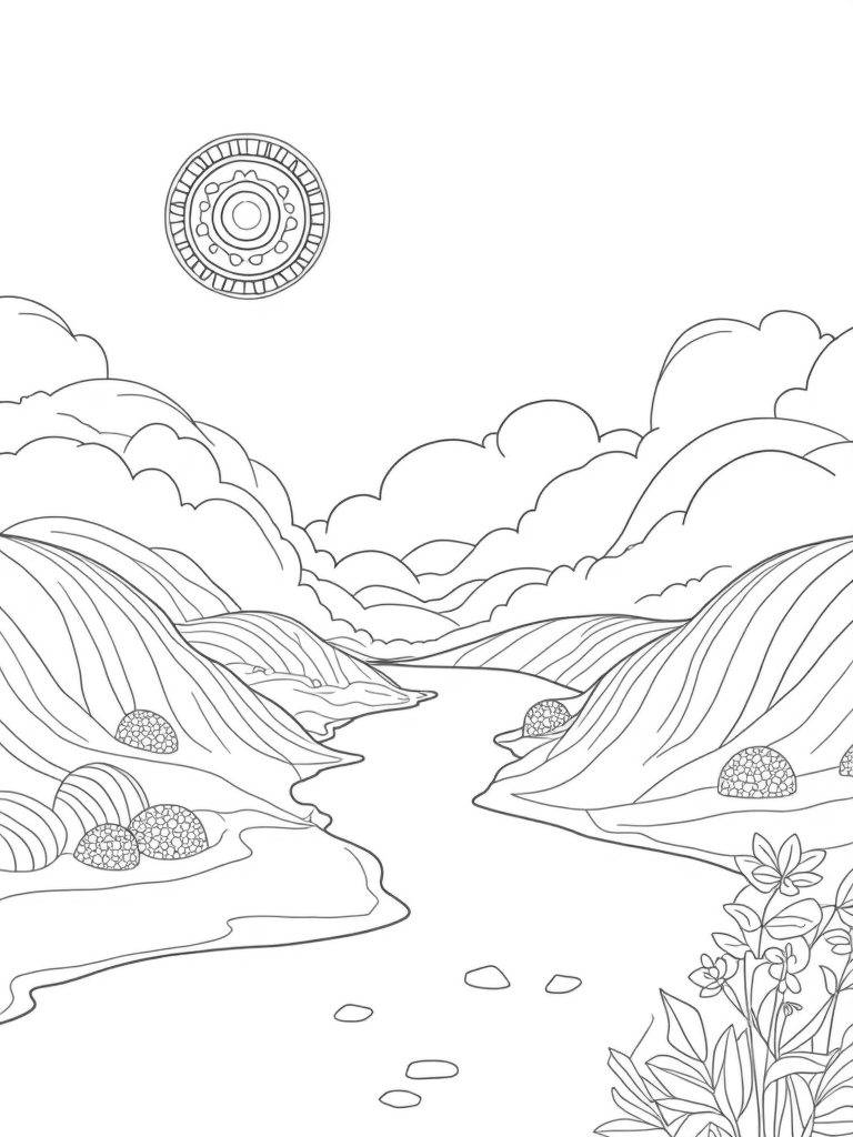 Cloudy Hills with Geometric Flowers and a Glassy River Coloring Page