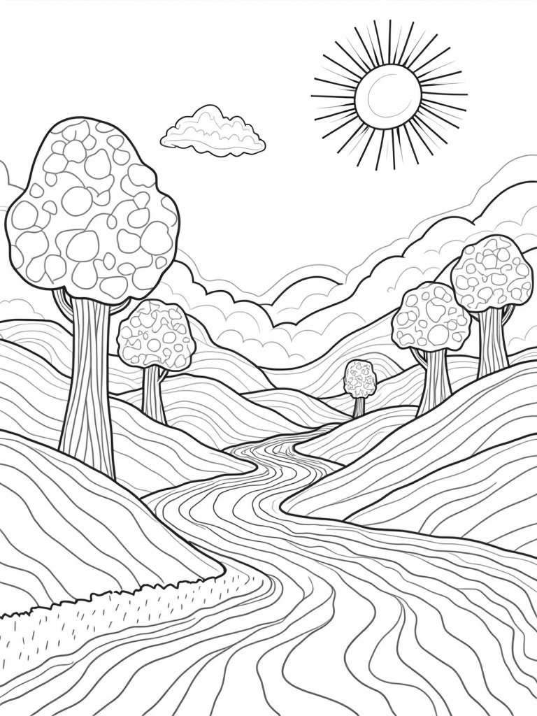 Check out this free, printable coloring page featuring a whimsical landscape with patchwork hills and paintbrush skies. Perfect for kids and adults alike, it's a fun way to unleash your creativity!
