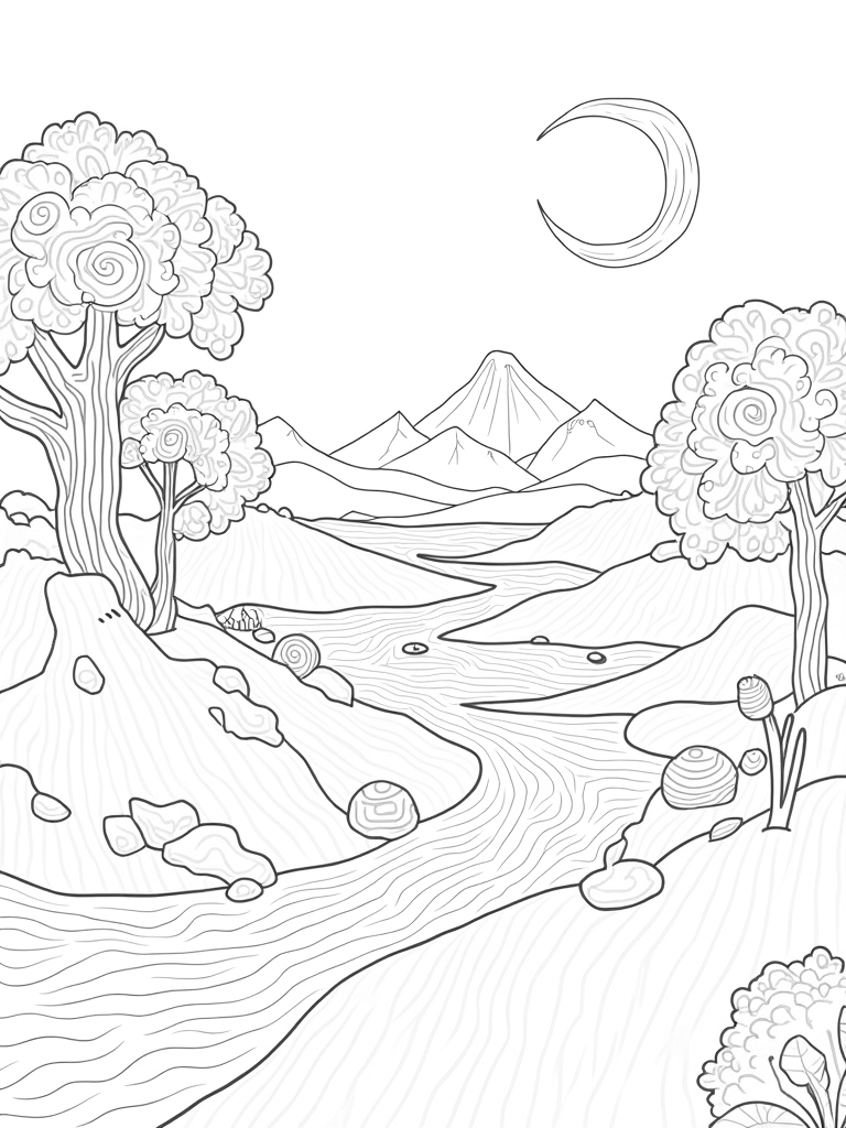 In this enchanting place, enormous trees with spiral trunks rise majestically, their leaves are designed like delicate lace patterns. It’s a perfect spot for kids to let their creativity run wild. And in the distance, a mountain range stands tall, its peaks resembling giant, jagged crystals that sparkle under a crescent moon. What a beautiful place to color!