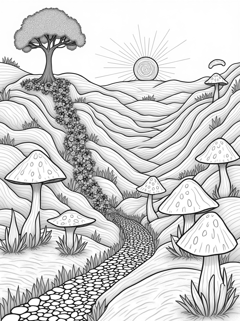 This picture is perfect for letting your creativity flow. There’s so much to color, from the intricate floral patches to the unique gear-shaped leaves. Grab your favorite coloring tools and make this dreamscape come to life!