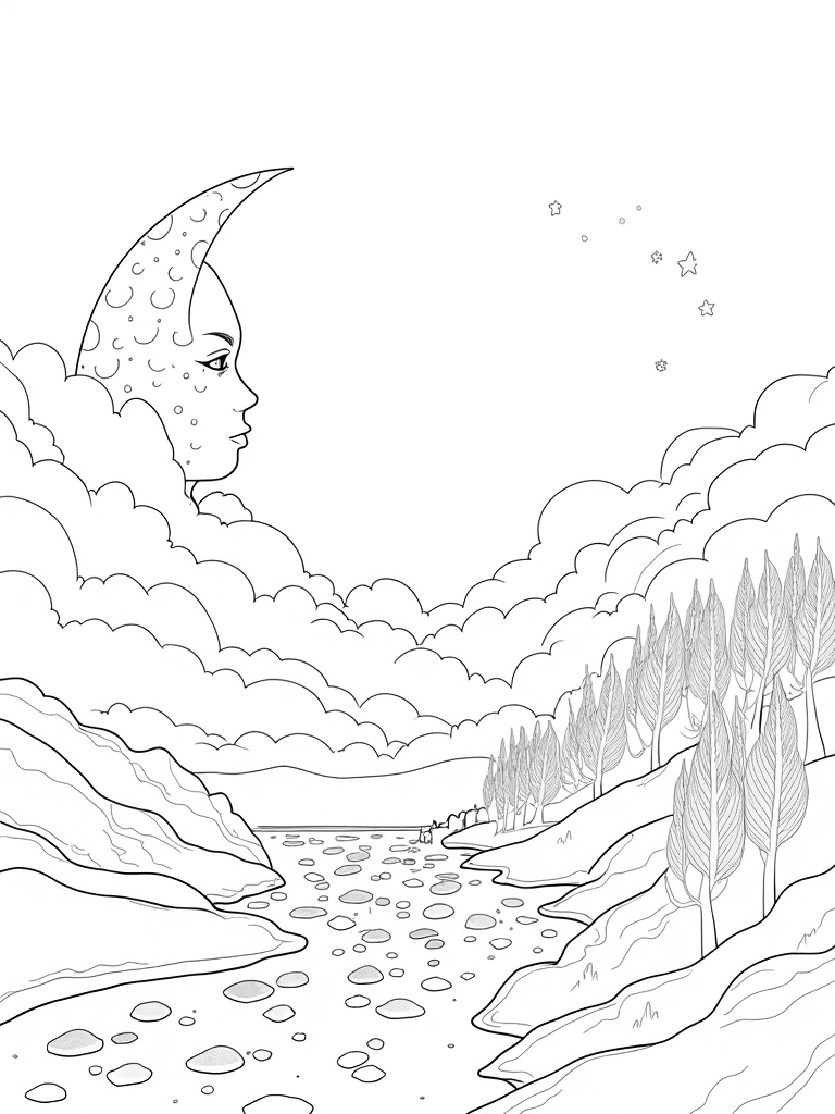 This scene is all about dreamy vibes, with oversized, swirling clouds in soft pastel colors. They cast playful shadows over a lush, rolling hill. A giant crescent moon sits low on the horizon, decorated with unique patterns that are just waiting for your favorite colors. Below, there's a river made of colorful stones that sparkles under the moonlight, creating a magical atmosphere.