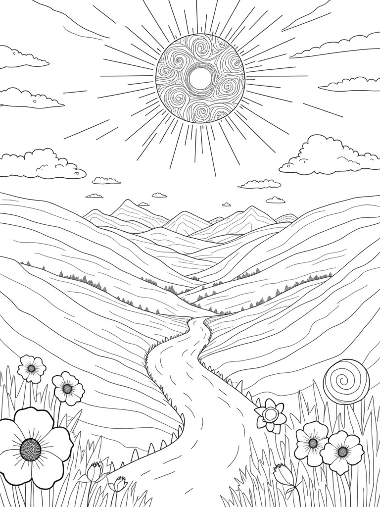 Above all of this beauty, a massive sunburst of swirling clouds fills the sky, casting intricate shadows below. The mountains in the distance rise tall, each peak adorned with whimsical spirals and fluttering banners. This whole picture is a mix of calm and whimsy, perfect for letting your imagination run wild as you color!