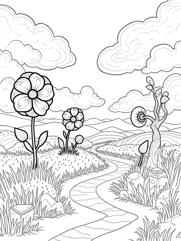 Imagine a magical meadow filled with flowers so big they look like they could touch the sky! Each flower has its own unique patterns inside the petals, just waiting for your favorite colors to bring them to life. A gentle river winds through the scene, with smooth stones that have cool geometric designs carved into them, perfect for your creative touch.