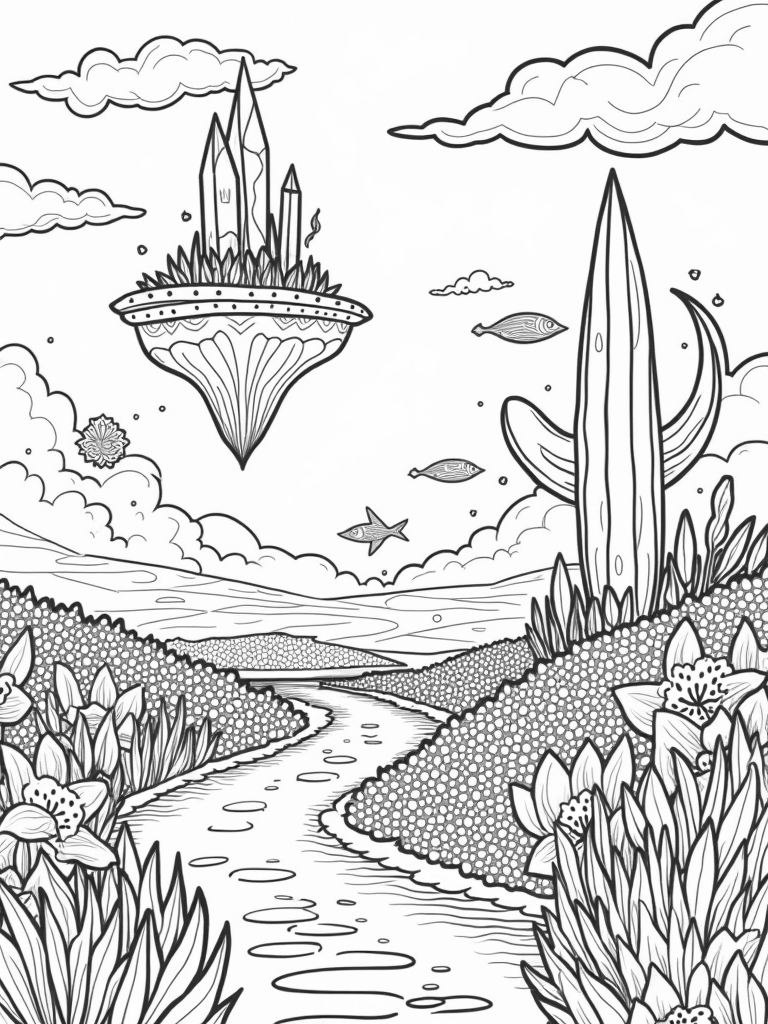 Check out this free, printable coloring page featuring a stunning landscape with floating leaf islands and a magical crystal tree. Perfect for kids who love vibrant, imaginative scenes, this design offers hours of creative fun.