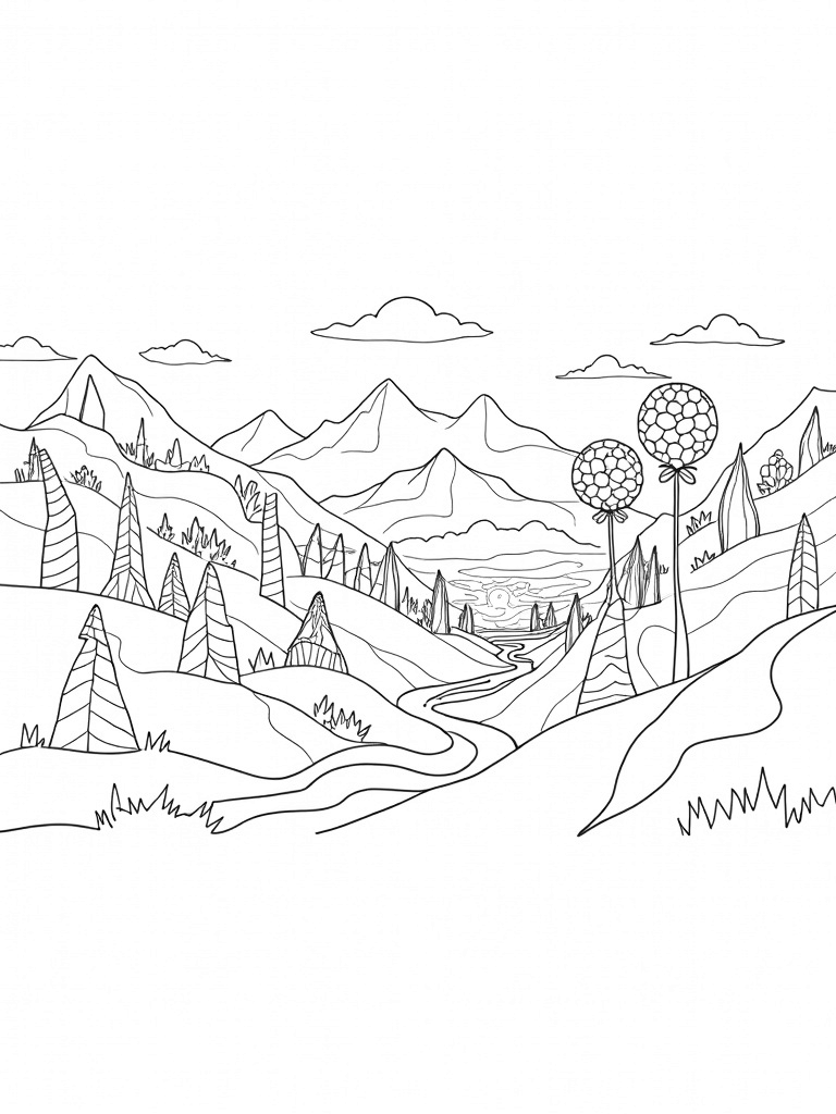 Imagine a world where hills roll like waves, each one covered in fun geometric patterns. In the foreground, you’ll find some unique trees with checkerboard trunks that twist and turn towards the sky. Their leaves are colorful triangles, just waiting for your favorite hues. A winding river flows through it all, its surface sparkling like a mosaic, reflecting fluffy clouds drifting above.