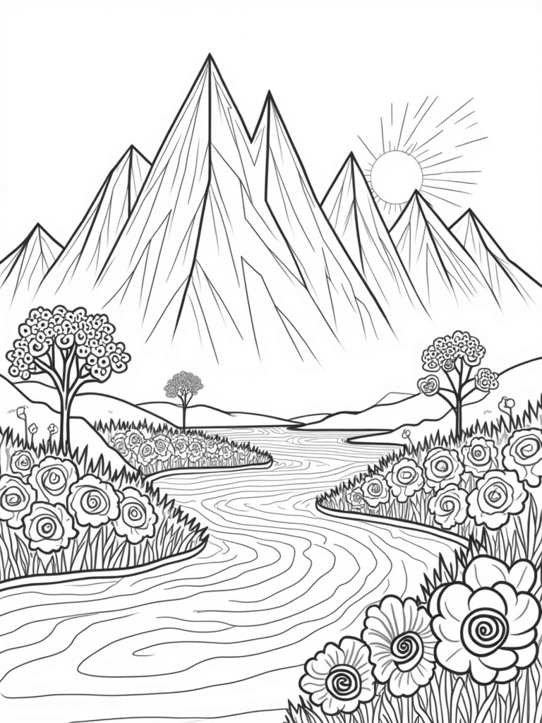 Majestic Mountain Range with Flowing River and Blooming Flowers Coloring Page