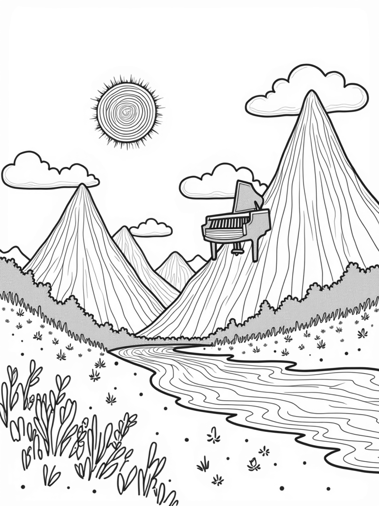 This free, printable coloring page showcases a tranquil mountain landscape with musical instruments. Perfect for kids and adults, it features a grand piano and a violin-shaped hill along with a shimmering river. Enjoy coloring this unique and whimsical scene!