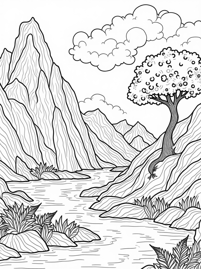 Imagine a magical mountain range where boulders are stacked high like a giant game of Jenga, each one textured and unique. Flowing rivers of shimmering ink twist through the valleys, their banks adorned with intricate leaf patterns that are just waiting for your favorite colors. Up above, fluffy, spiraling clouds dance in the sky, looking just like delicious cotton candy!
