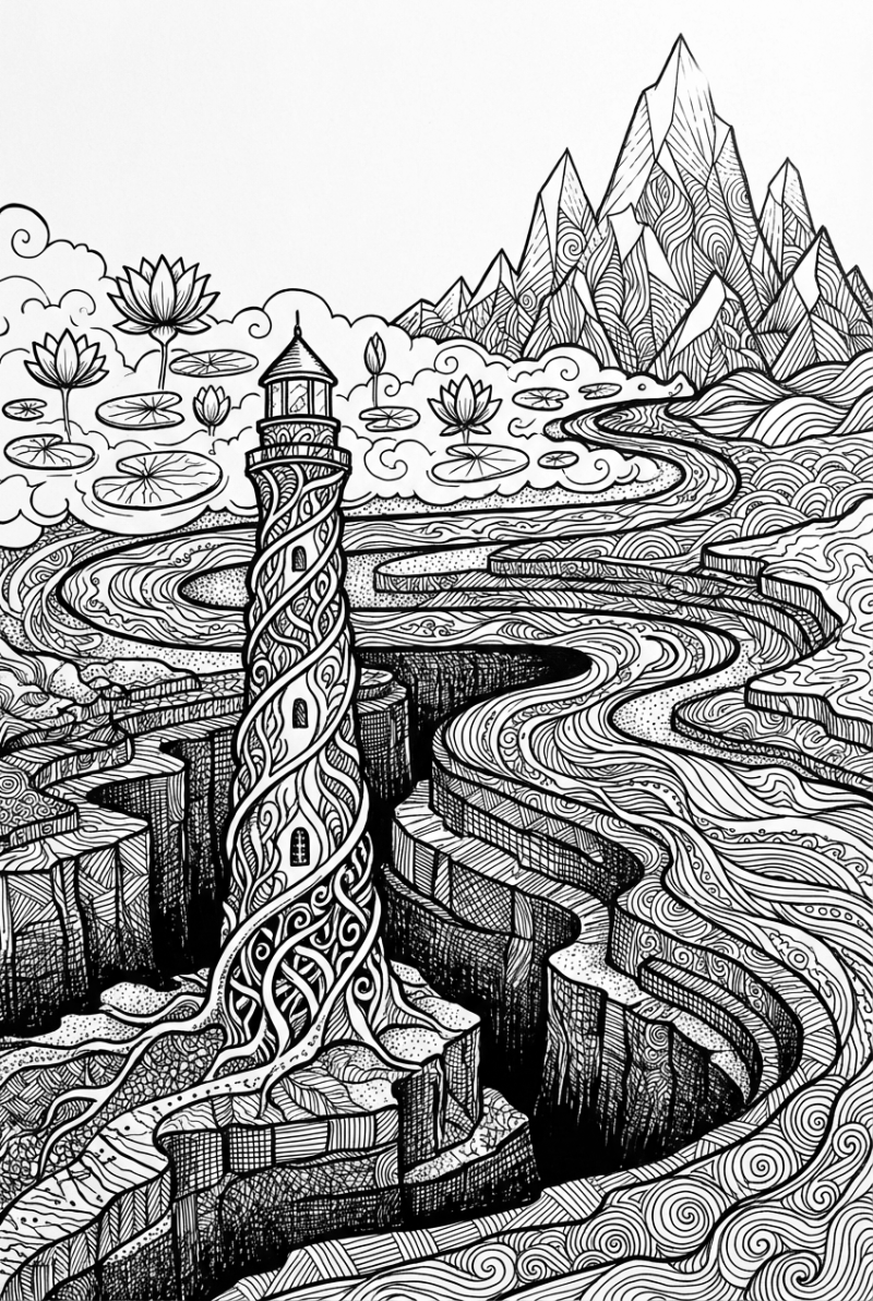 Take a look at this intricate line drawing – a deep black canyon carved into step‑like terraces, with a spiraled lighthouse made of twisting vines sprouting from the floor. A shimmering river of liquid silver snakes through the levels, and a floating garden of lotus blossoms hovers just above the water. In the distance, crystalline peaks catch the first light, adding a cool sparkle to the whole scene.