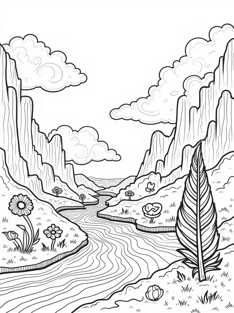 Get your favorite colors ready because this page is all about creativity! The oversized flowers give you plenty of room to experiment with vibrant colors, while the cliffs in the background are etched with intricate designs just waiting for your artistic touch. And don’t forget the fluffy clouds above—they're perfect for soft pastels or bold shades. You can even add your own twist to the swirling sky!
