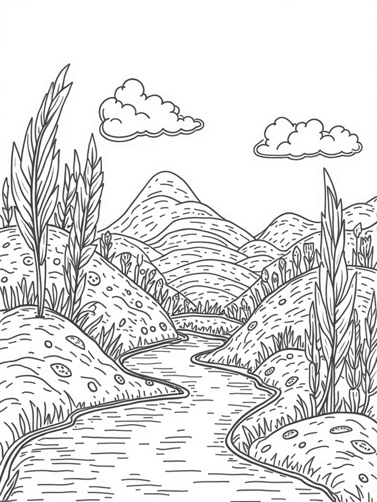 Check out this free, printable coloring page featuring a surreal landscape of patchwork hills, spools of thread, and an ink river. Perfect for adults looking to unwind with a fun coloring experience!