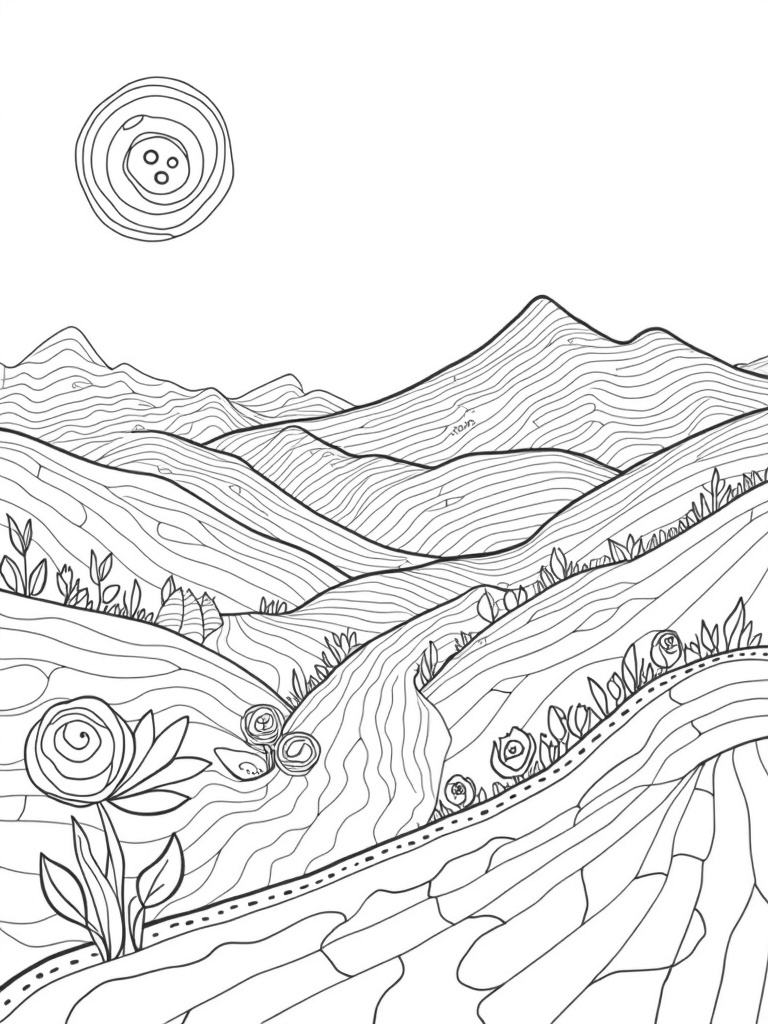 Check out this free, printable coloring page featuring a landscape of patchwork hills and a button sun. Perfect for relaxing creativity, this detailed design will inspire kids and adults alike!