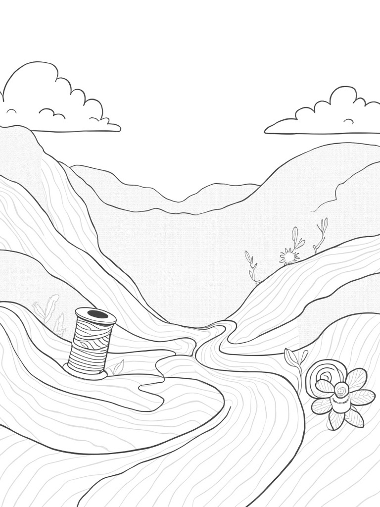 As you color in this serene scene, notice the oversized flowers blooming along the slopes. They have intricate designs, and their petals curl into fun spirals. Up in the sky, fluffy clouds take on the shape of giant yarn balls, adding a whimsical touch. And don’t forget the winding river, flowing like brush strokes and reflecting a rainbow of colors. It’s a place where creativity and calmness meet!