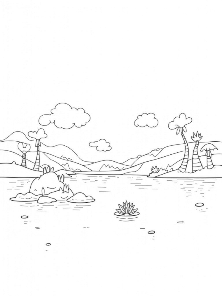 At the water's edge, you'll find smooth stones stacked into fun totem shapes, perfect for sparking a bit of imagination. A gentle breeze creates tiny ripples on the lake, and if you look closely, you might spot an intricately designed flower floating serenely on the surface. It's a little slice of nature that's just waiting for your favorite colors!