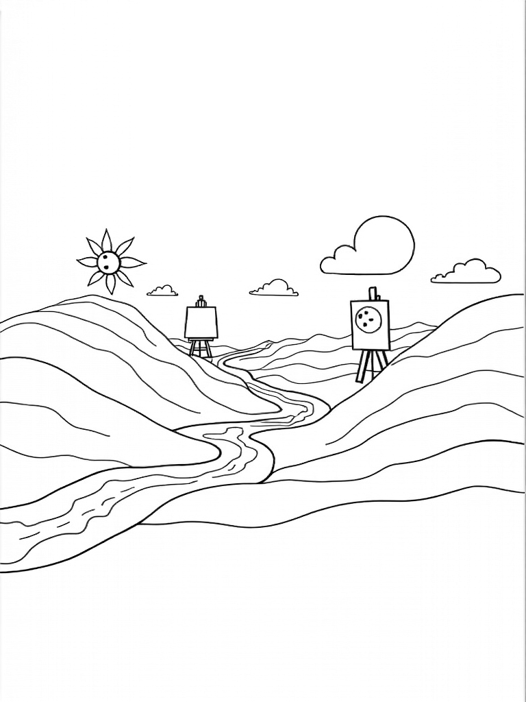 One of the hills features a giant easel, standing tall and proud, with a blank canvas just waiting for your artistic touch. Fluffy clouds shaped like palettes float lazily above, offering inspiration. And don’t forget about the radiant sun with its playful geometric rays, casting fun patterns on the ground below. Just imagine the colors you could use here!