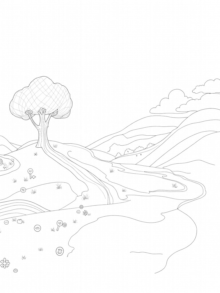 Patchwork Hills and Quilted Tree Coloring Page