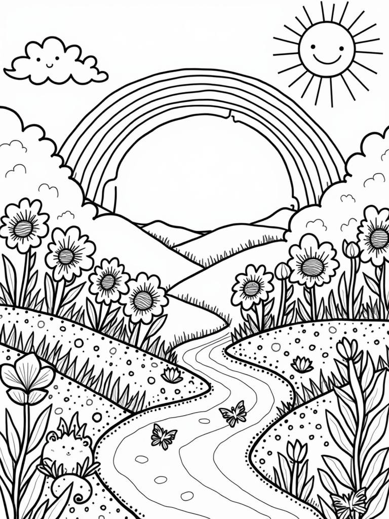 In the background, soft rolling hills create a gentle horizon, leading up to a smiling sun. With its rays stretching down, it feels like the sun is giving you a warm hug, encouraging you to grab your crayons and dive into this delightful world!