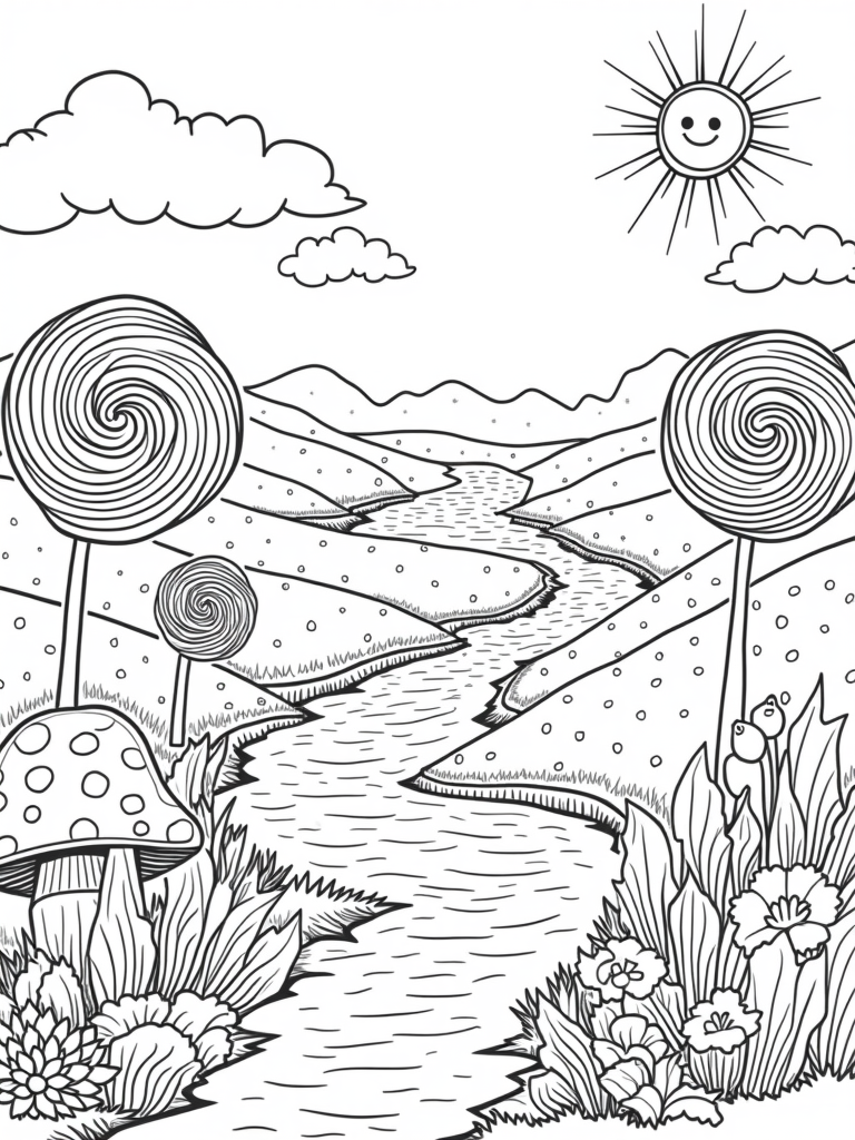 Rolling Hills with Lollipops and Cotton Candy Clouds Coloring Page