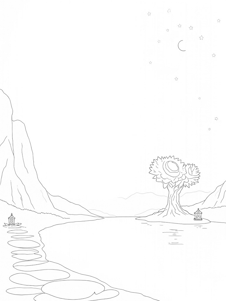 Check out this free, printable coloring page of a serene lake nestled between mountains. With glowing lanterns on lily pads and a beautiful island, this landscape coloring page is perfect for kids and adults alike!