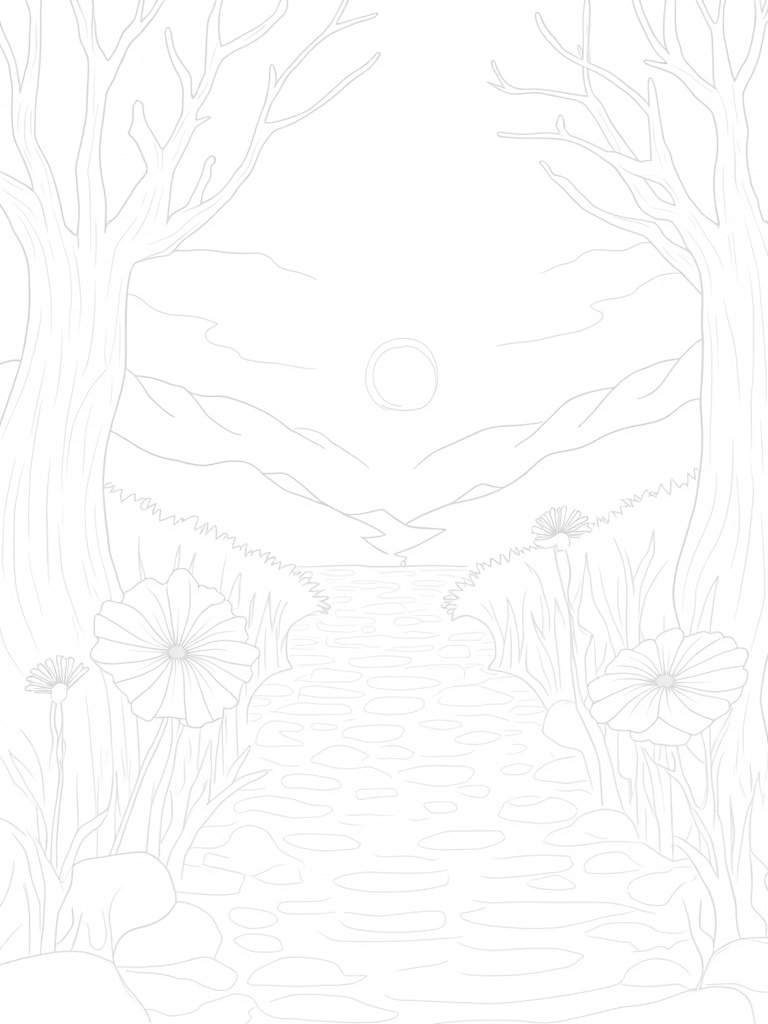 In the foreground, there’s a winding path made of smooth stones that leads your eyes to the horizon. You can almost feel the warmth of the radiant sun as it sets behind the mountains, casting long shadows across the landscape. It's a perfect spot to relax and let your imagination wander while you color!