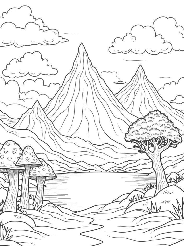 Serene Mountain Landscape with Giant Mushrooms and Twisting Vines Coloring Page