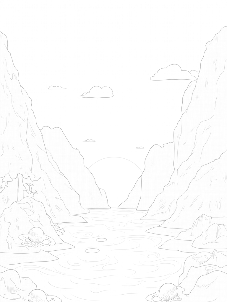 This scene captures a breathtaking mountainous landscape where towering, twisted trees peek out from rocky cliffs. Their branches create beautiful shapes against the sky, inviting your imagination to wander. Below, a peaceful river winds through the scene, its gentle currents bringing oversized lily pads that look almost like floating plates of green. It’s a perfect spot for a little adventure!